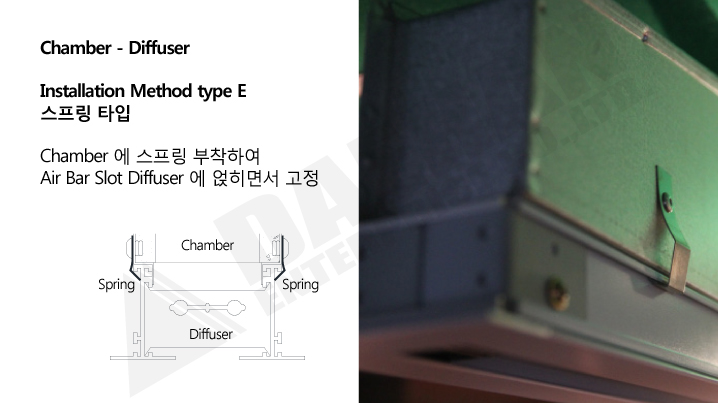 DH-CLDF Calm Line Diffuser는 공기 조화 계통에 Side Walls, Sills 및 Floor용 설치에 적합하도록 설계되어 있어 건축의 미적 감각 및 우수한 성능을 겸비한 것으로 Diffuser 길이 방향으로 고정 Bar가 있는 형태입니다. 용도는 Fancoil Box, 엘리베이터 홀, 커튼월 빌딩의 창문가, 3.5m 이상 천장, 바닥 급배기, 벽 급배기용, 섬유공장, 크린룸, 전산실, 기타 배기용 등에 적합합니다.